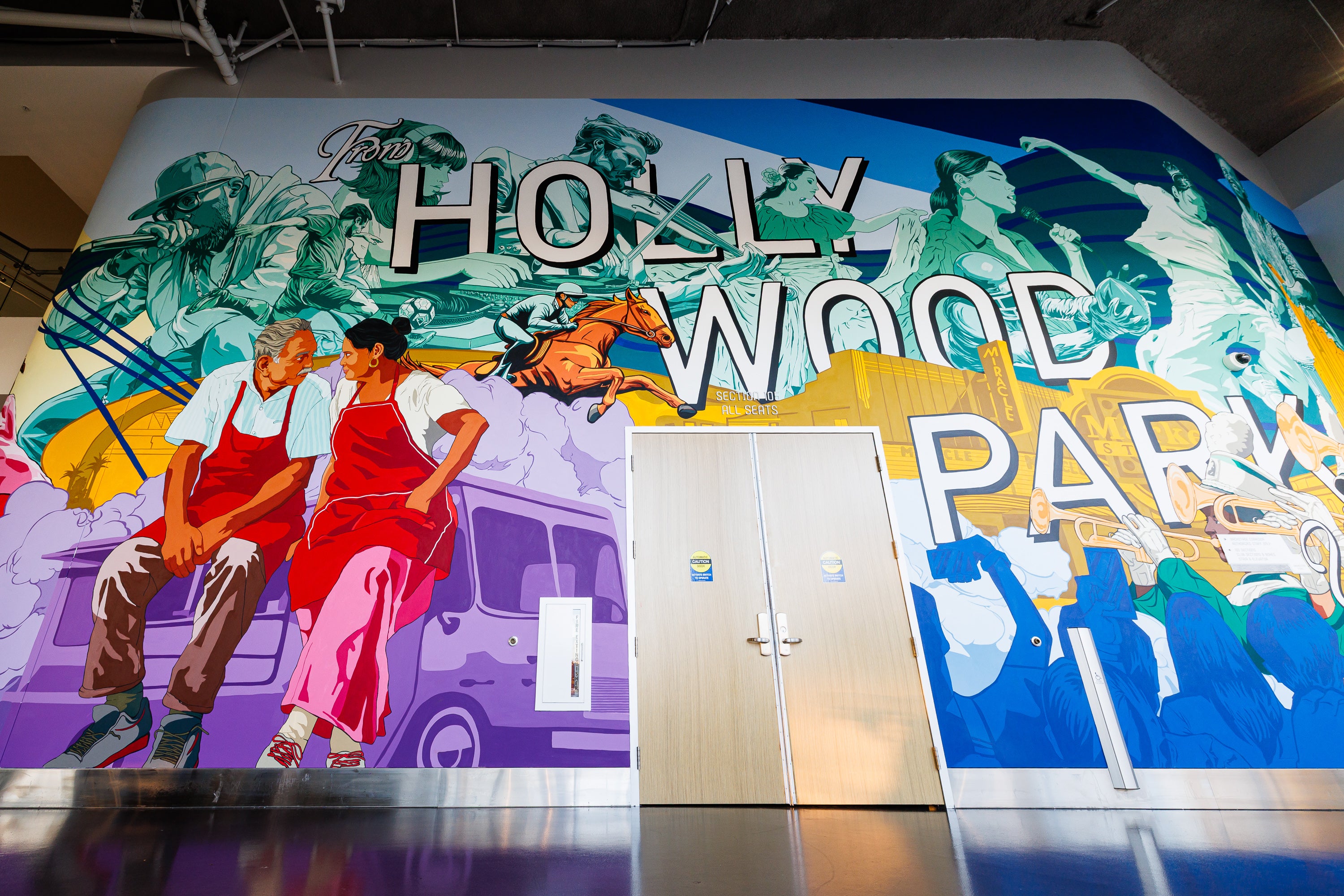 From Hollywood Park, With Love is a site-specific mural presented by Ticketmaster and created by AQMNI (Ethel & Carlo Zafranco) for YouTube Theater as a love letter from Hollywood Park to its home in Inglewood. By layering neighborhood moments with legendary landmarks and performers, the artwork honors the city's creative history while cementing Hollywood Park's role as a persisting cultural landmark and global stage.